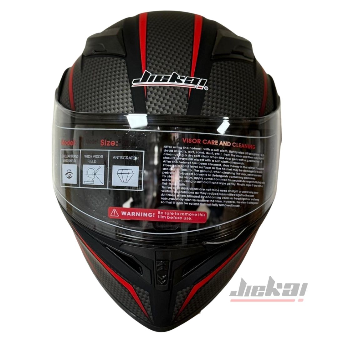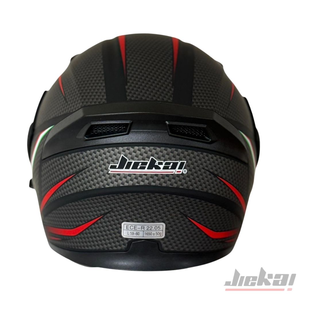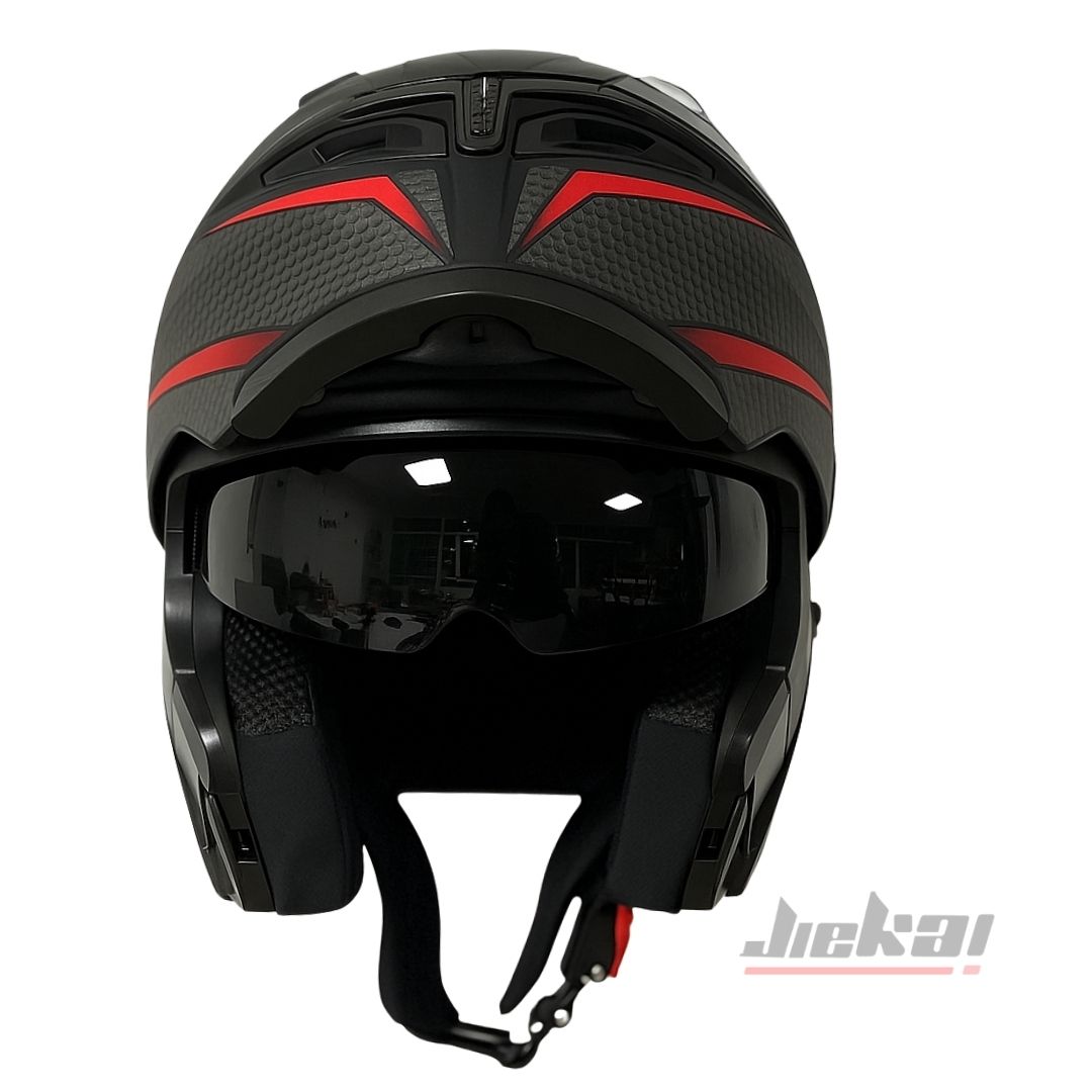 JIEKAI JK-902, modern sürücüler için tasarlanmış çene açılır mekanizması ile hem tam kapalı kask güvenliğini hem de açık kask pratikliğini bir araya getirir. Karbon desenli özel tasarımıyla dikkat çekerken, çene pedi sayesinde ekstra konfor ve koruma sağlar.