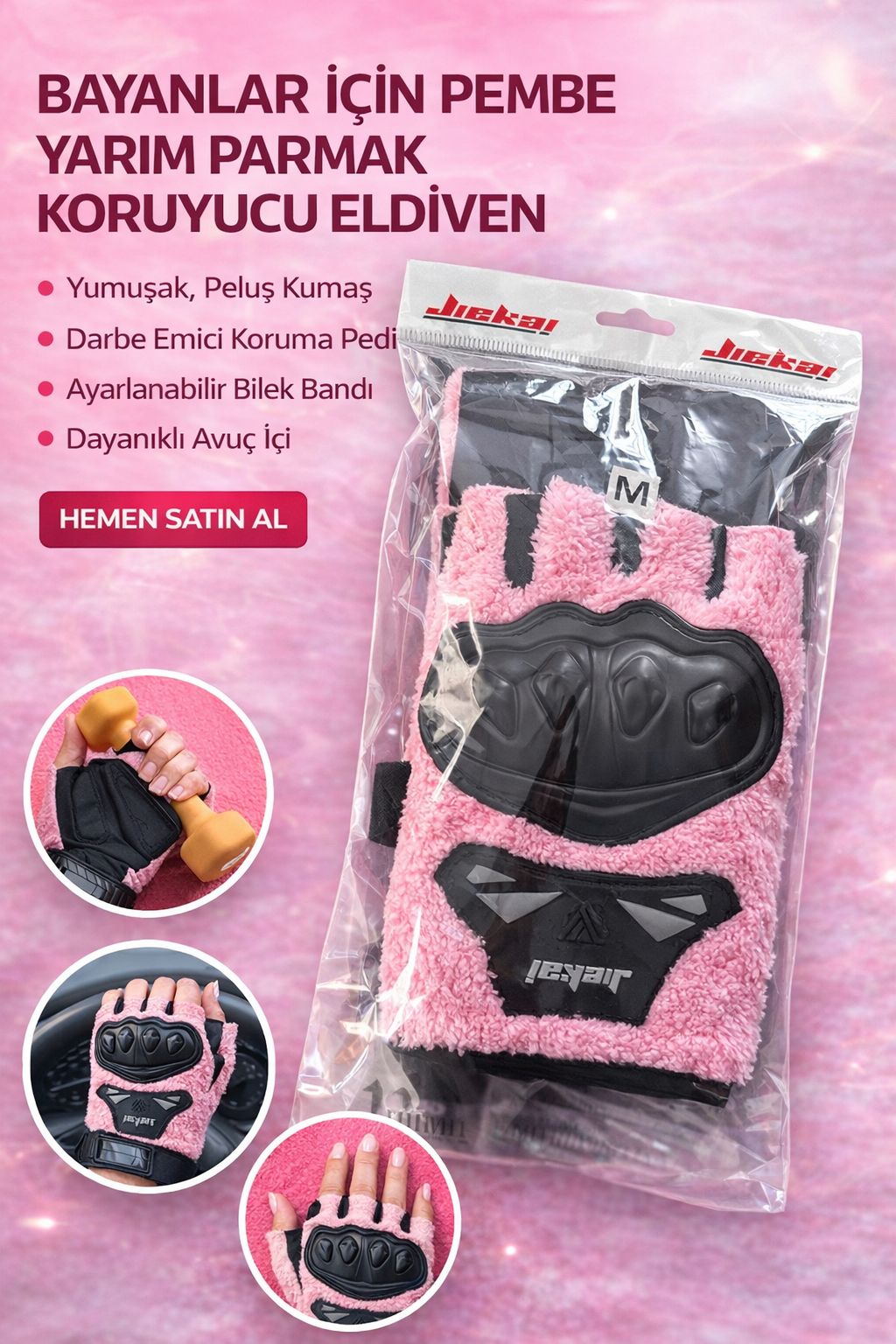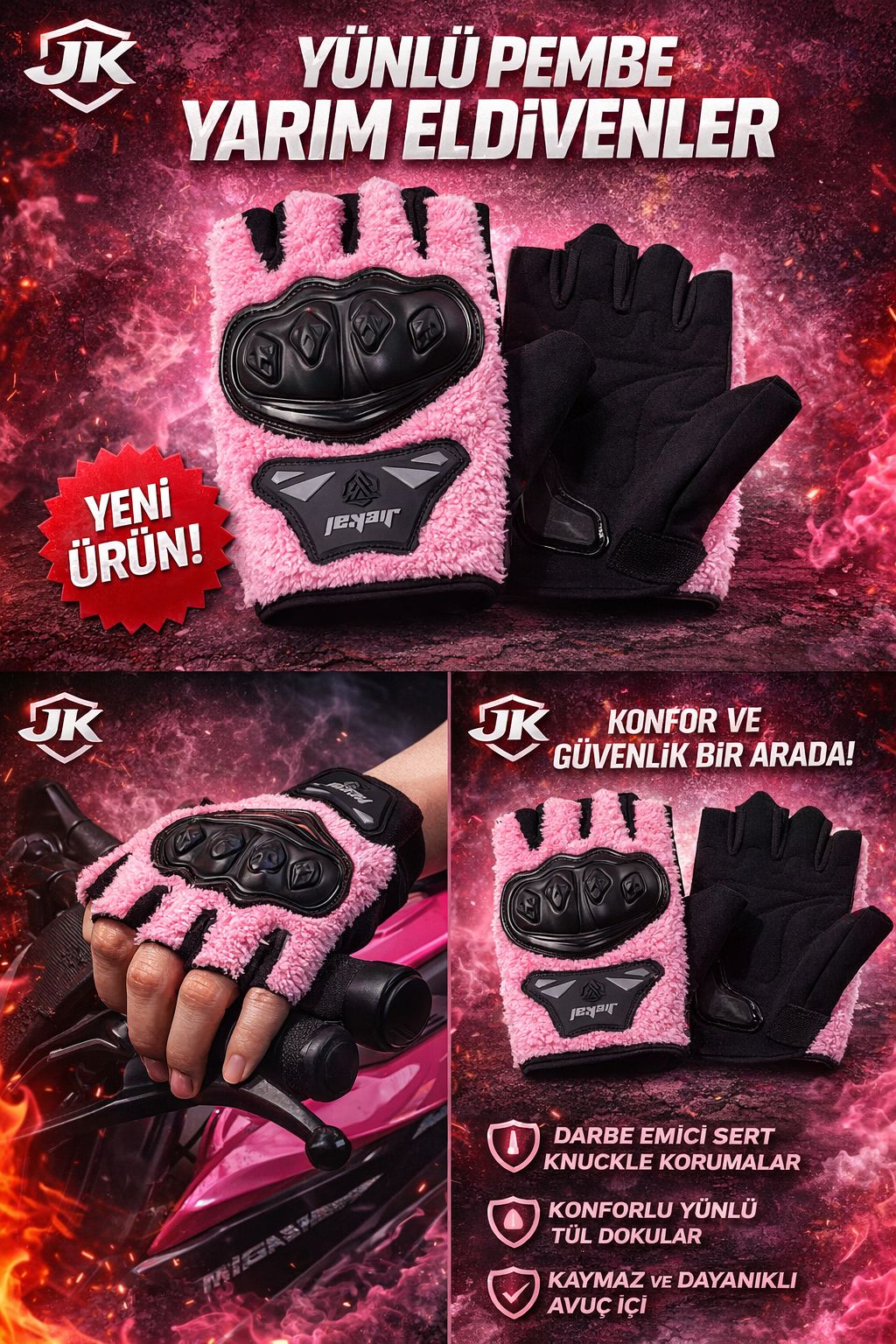 JK Peluşlu Yarım Eldiven, konforu, sıcak tutan yapısı ve estetik tasarımı bir araya getiren özel bir üründür. Yumuşak dokulu peluş kumaşı ve dikkat çekici pembe rengi ile hem şık bir görünüm sunar hem de soğuk havalarda sürüş keyfini artırır. Günlük kullanım ve motosiklet sürüşleri için ideal olarak tasarlanmıştır.